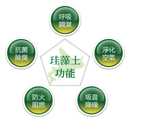 珪藻土為超微細、超多孔質的輕量土,孔隙數(Porous)大約是木炭的5~6,000倍,能夠吸附大量的水分,具有吸放濕性(呼吸性)的活化效果,可防止結露、反潮,抑制發霉、蝨子的產生。最大特性就是可針對甲醛、乙醛進行吸附與分解,可矯正建築因各種內裝物而造成的空氣品質不良問題,讓居家環境更健康。珪藻土適合用在全室內的牆面及天花板,可有效改善室內空氣品質。